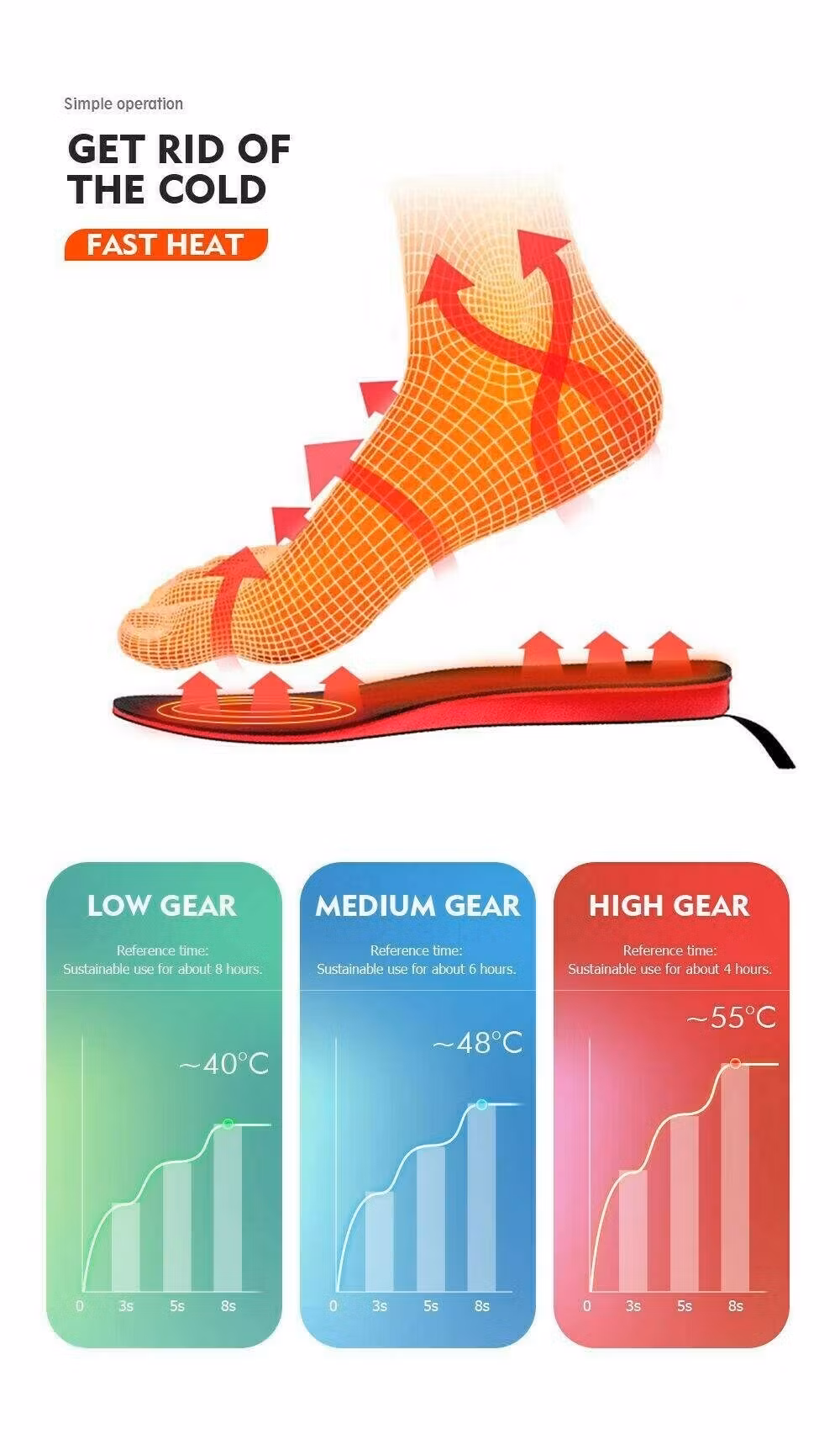 Material Plast och kolfiber Färg Röd och svart Storlek 35?39 och 40?45 (kan klippas till exakt passform) Sulans mått 26 x 9 x 5 cm Förpackningens mått 30 x 10 x 2 cm Vikt 297 g Batterikapacitet 2 000 mAh Spänning 3,7V Laddningstid 4 timmar Laddas med USB-kabel (som ingår)